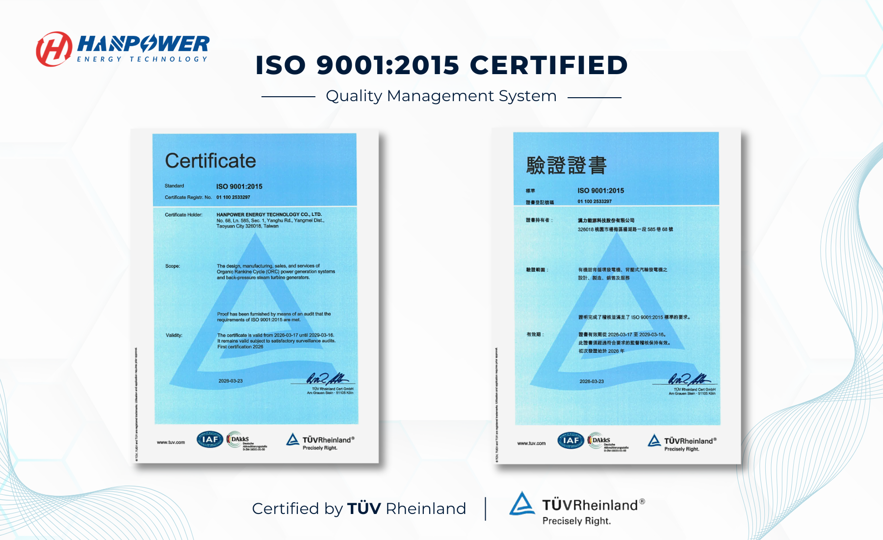 漢力公司的品質政策核心為「卓越系統、智慧創節、永續發展」,品質管理精神融入產品設計開發、高效節能、資源最佳化及長期營運策略中。品質不僅是管理要求,更成為推動永續發展的重要動力。